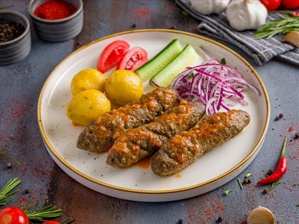 Люля-кебаб — сытное горячее блюдо из нежной говядины с картофелем и луком.